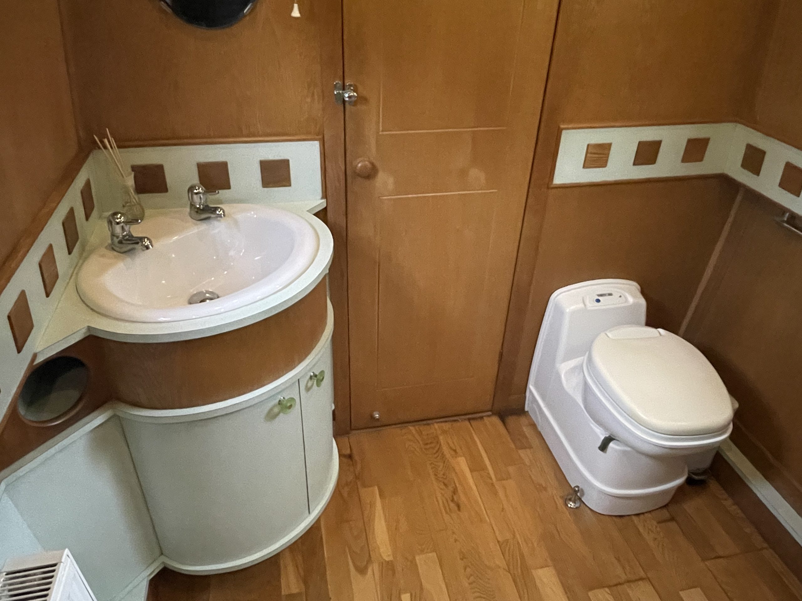 The bathroom untilises the full width of the boat to maximise space with full size quadrant shower, cassette toilet with spare cassettes, contemporary washbasin with vanity cupboard and mirror.