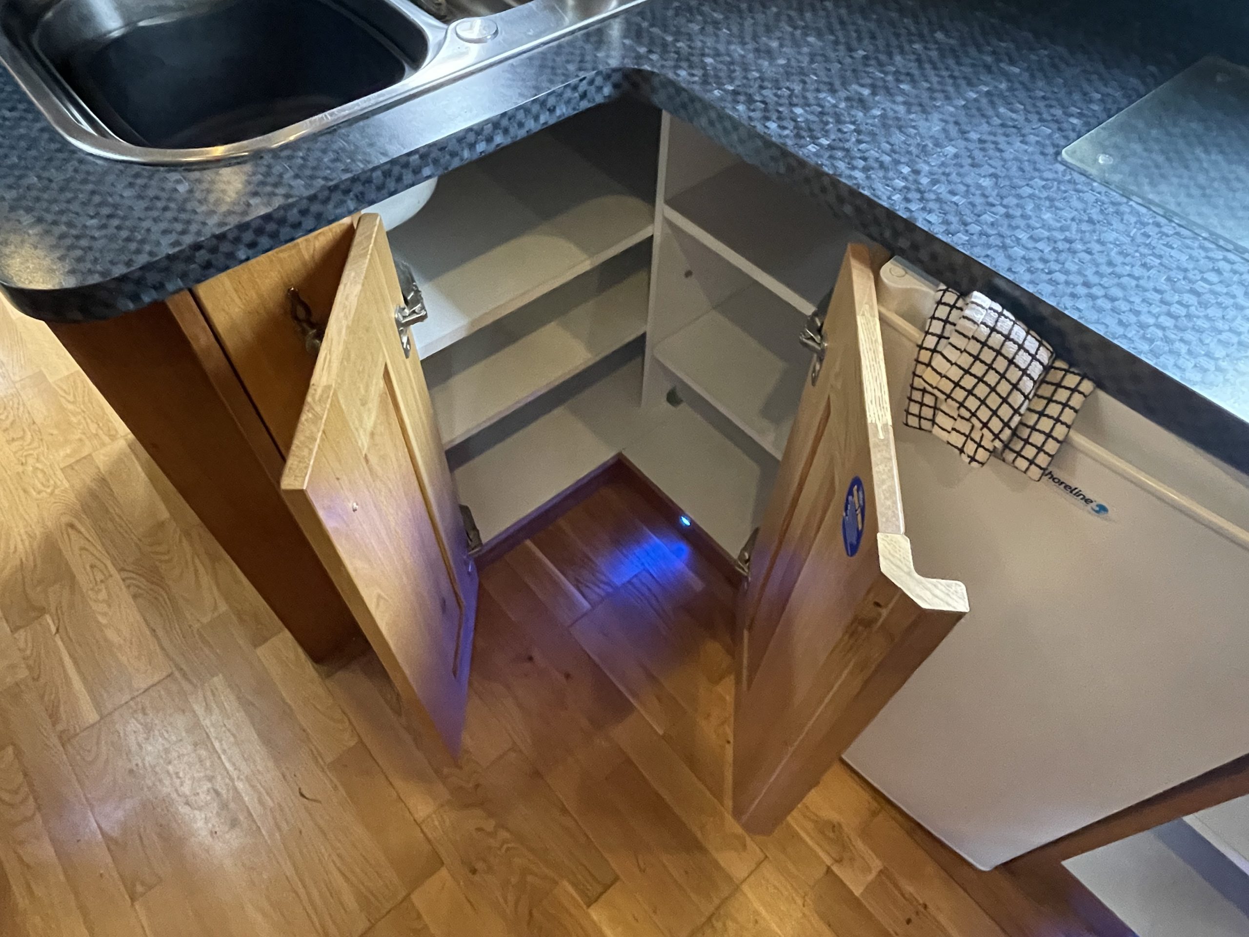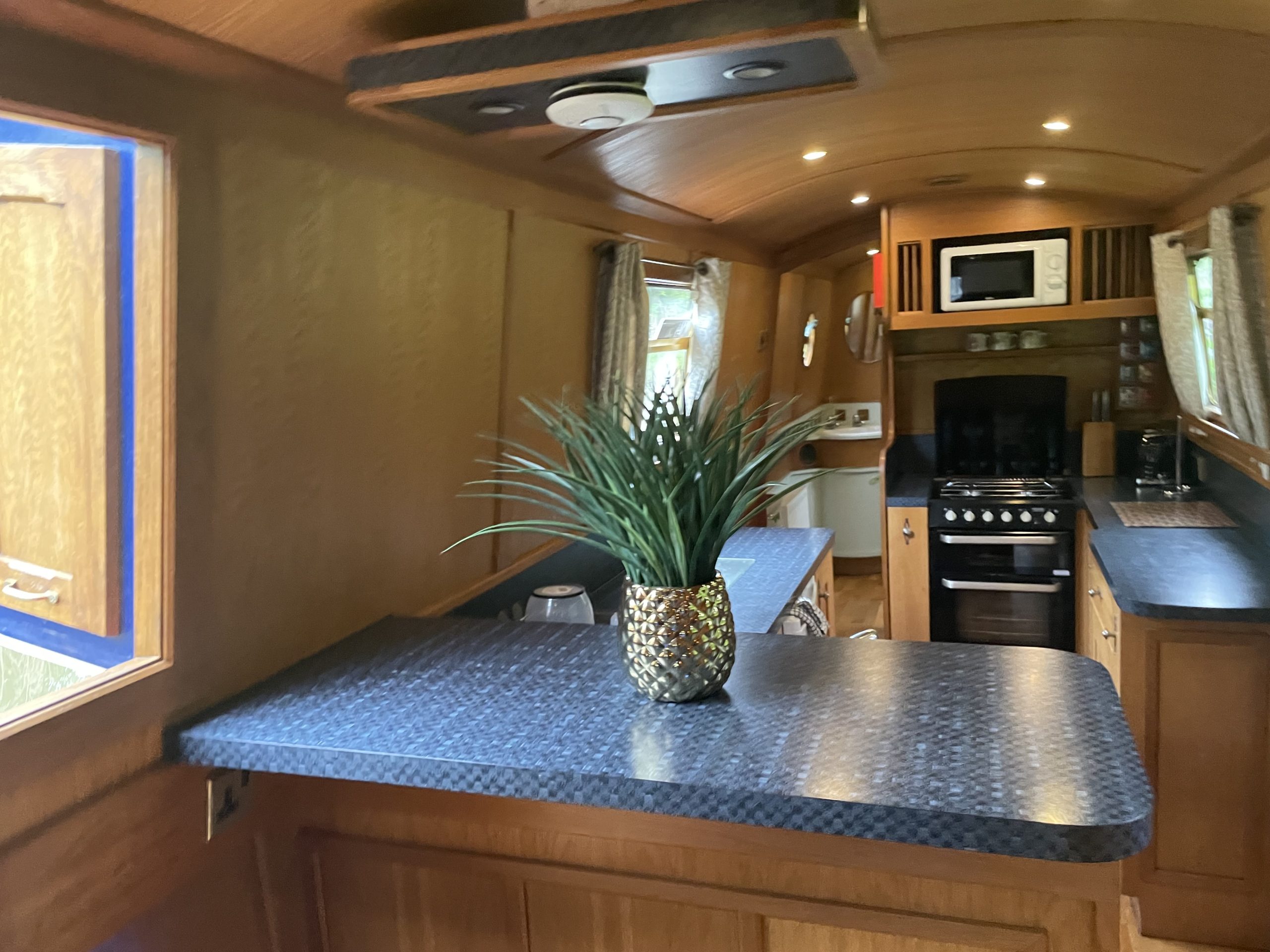 Next you have a very well appointed galley with new 12v fridge, microwave, like new cooker and again masses of storage space.