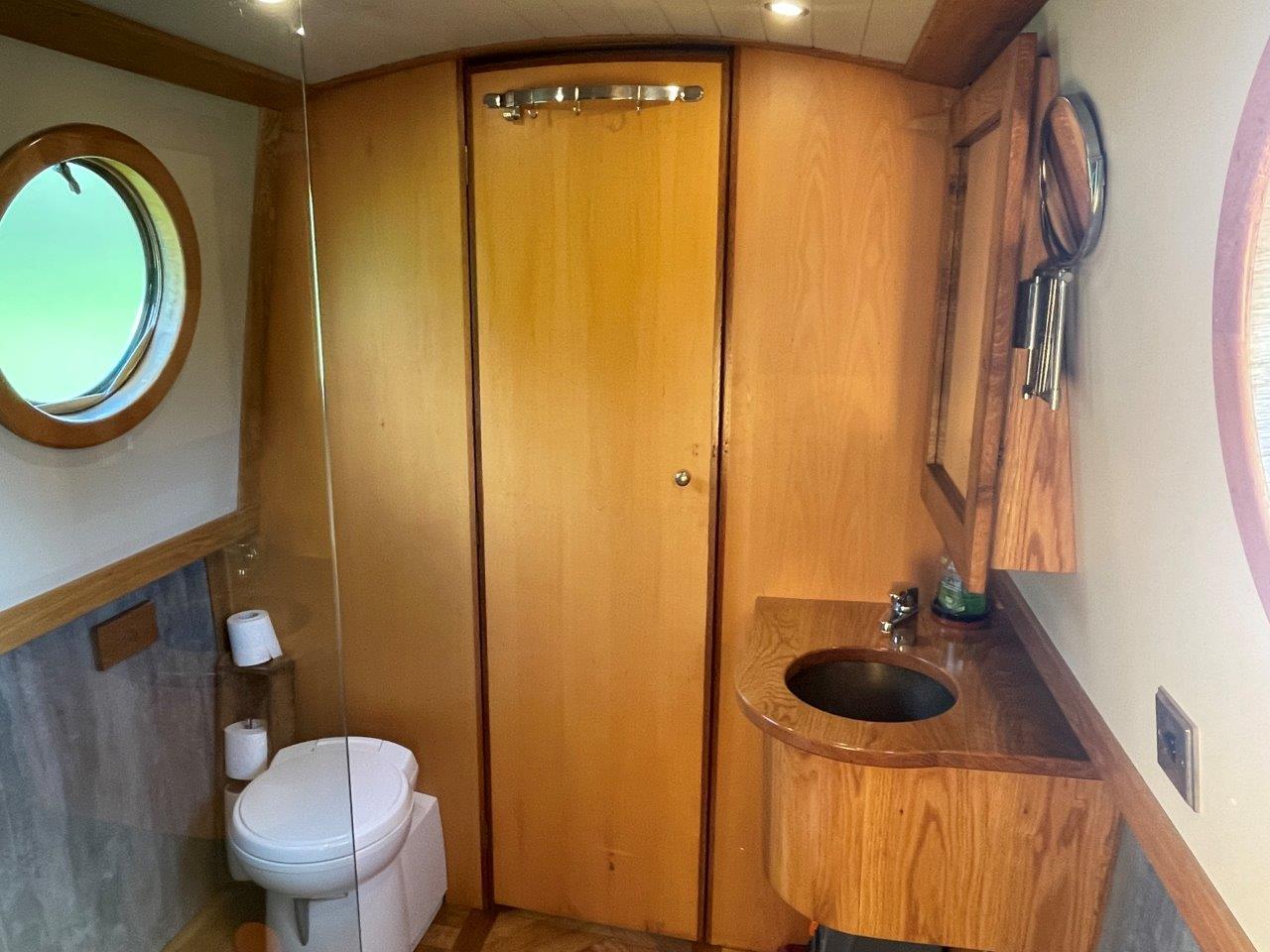 Walkthrough bathroom with walk-in large shower, bespoke wash basin counter with mirrored vanity cuboard above. Toiet is a Thetord cassette wity 3 spare cassettes so never to be caught short.