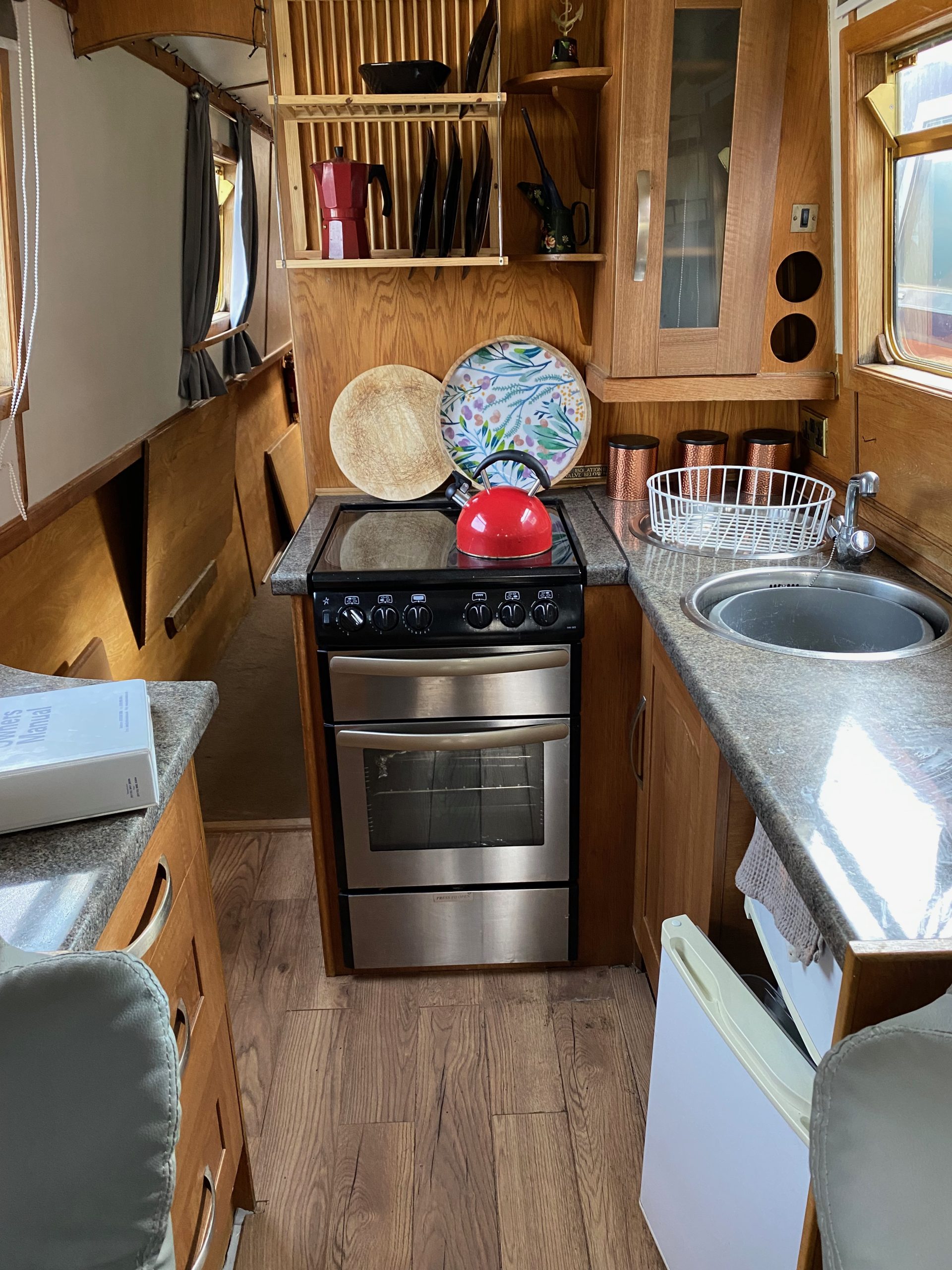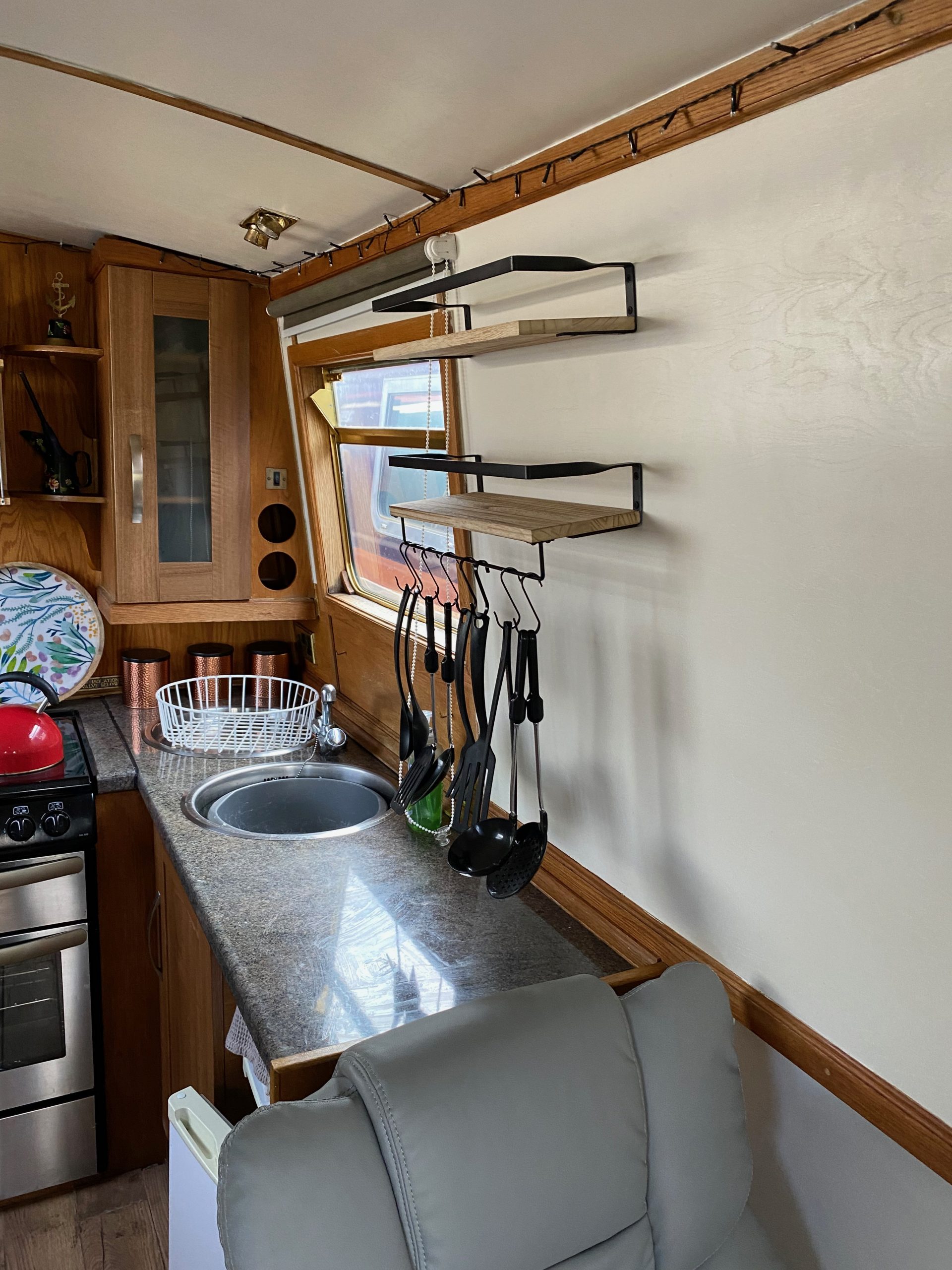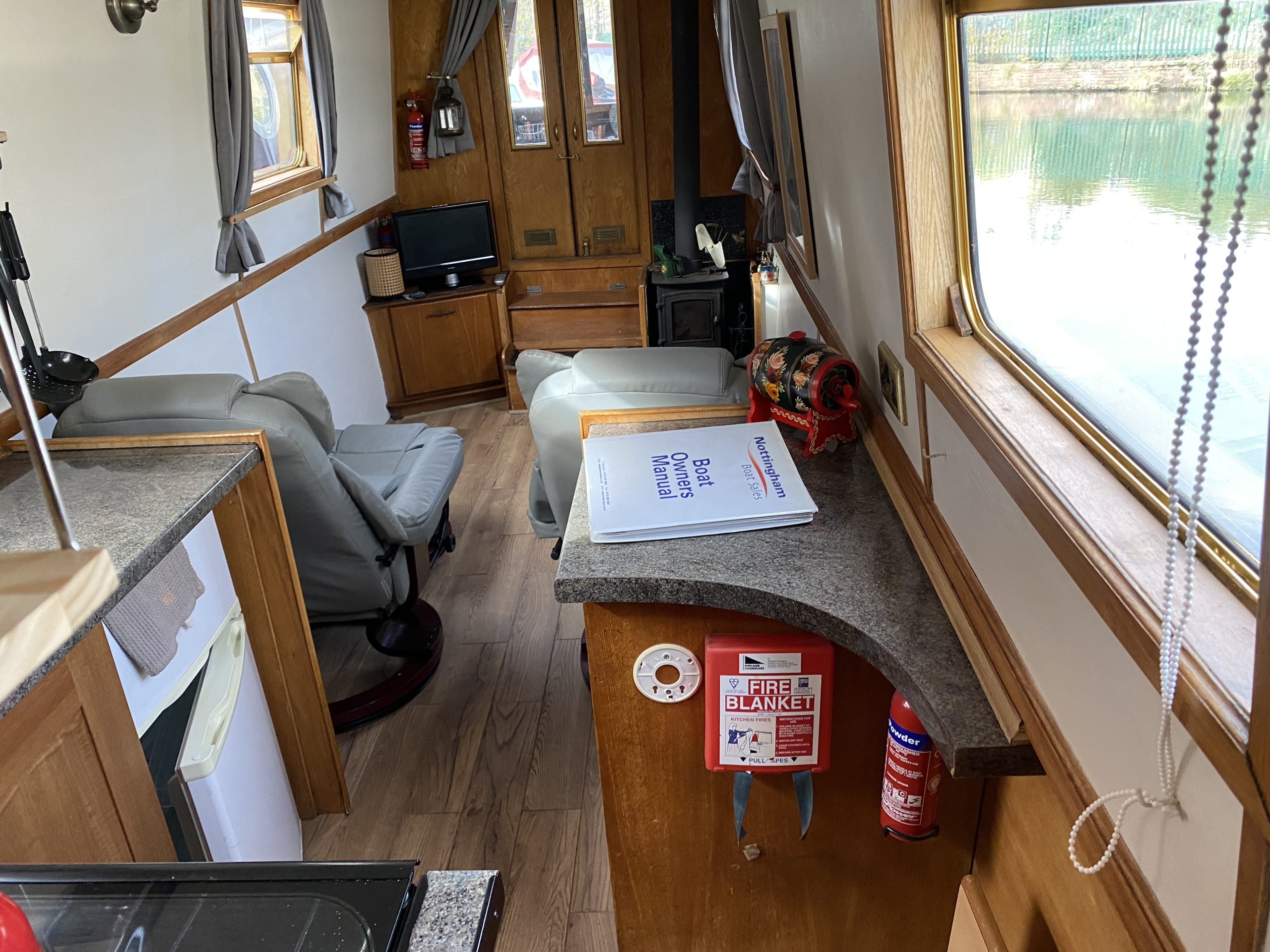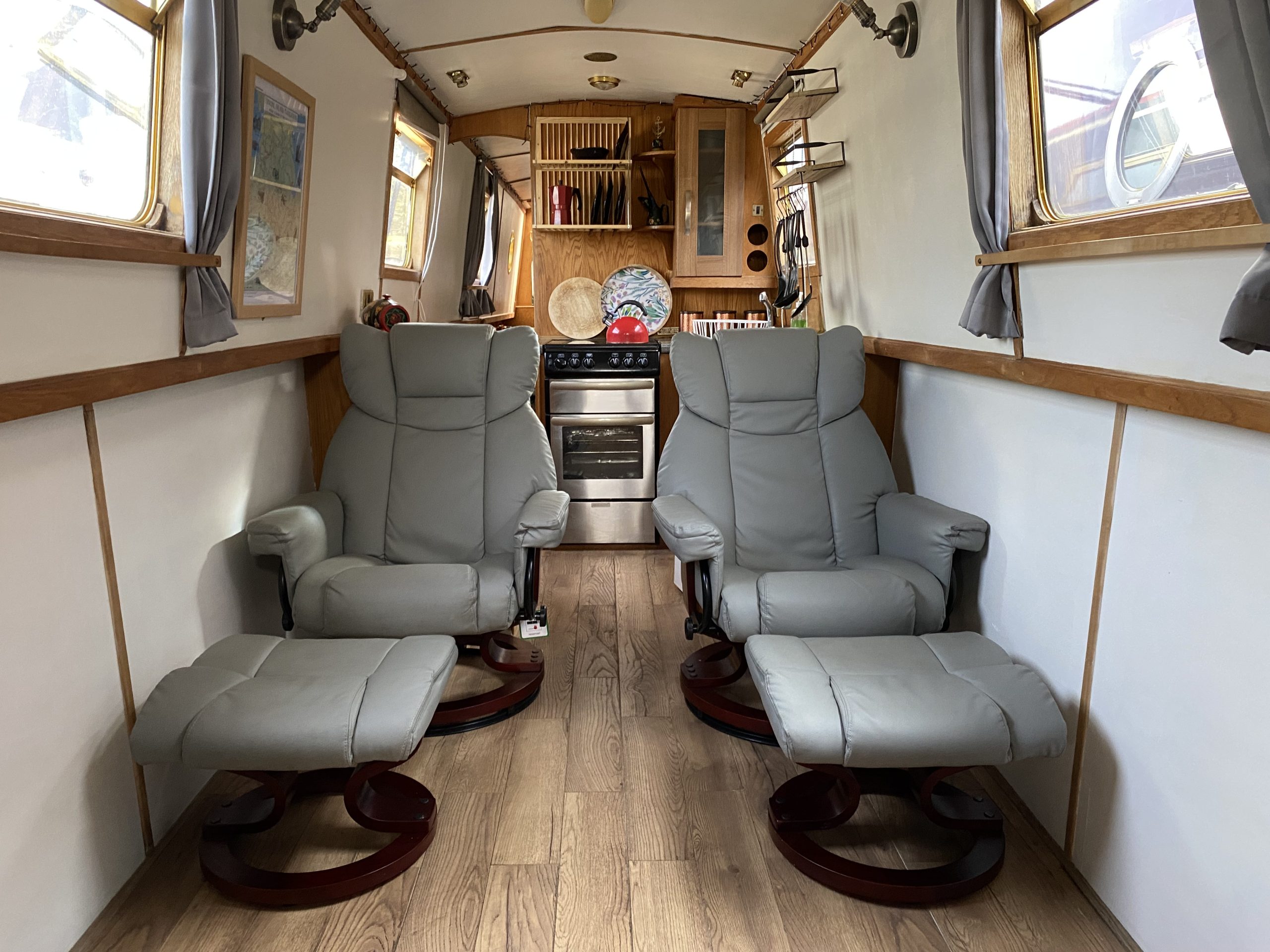 Has solid fuel stove to front starboard corner and tv cabinet on port side, it has two leather recliner chairs
