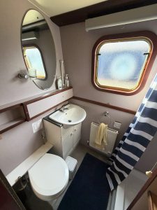 Bathroom: Pump out toilet, shower, wash basin & vanity unit, mirror, shelf, radiator.