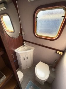 Toilet Closet: Pump out toilet, wash basin & vanity unit, shelves.
