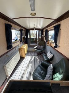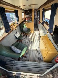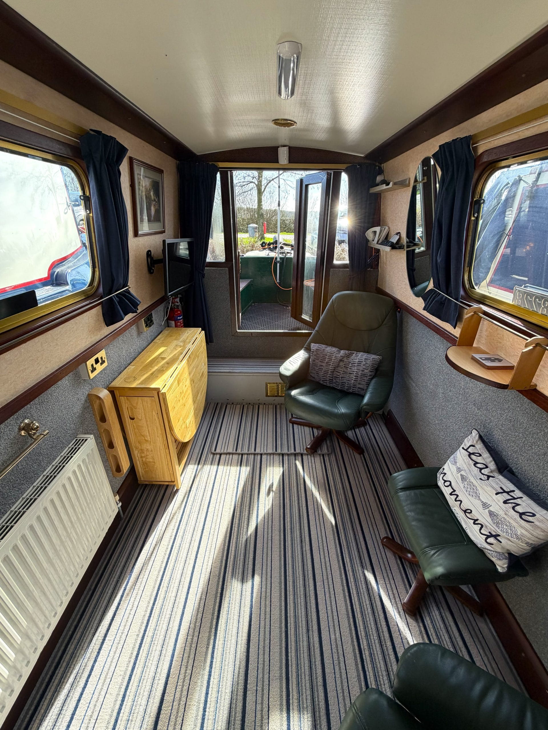 Saloon: 2 chairs & 1 footstool, Toshiba tv, mirror, table, shelf, curtains, carpet, radiator, doors to the bow.