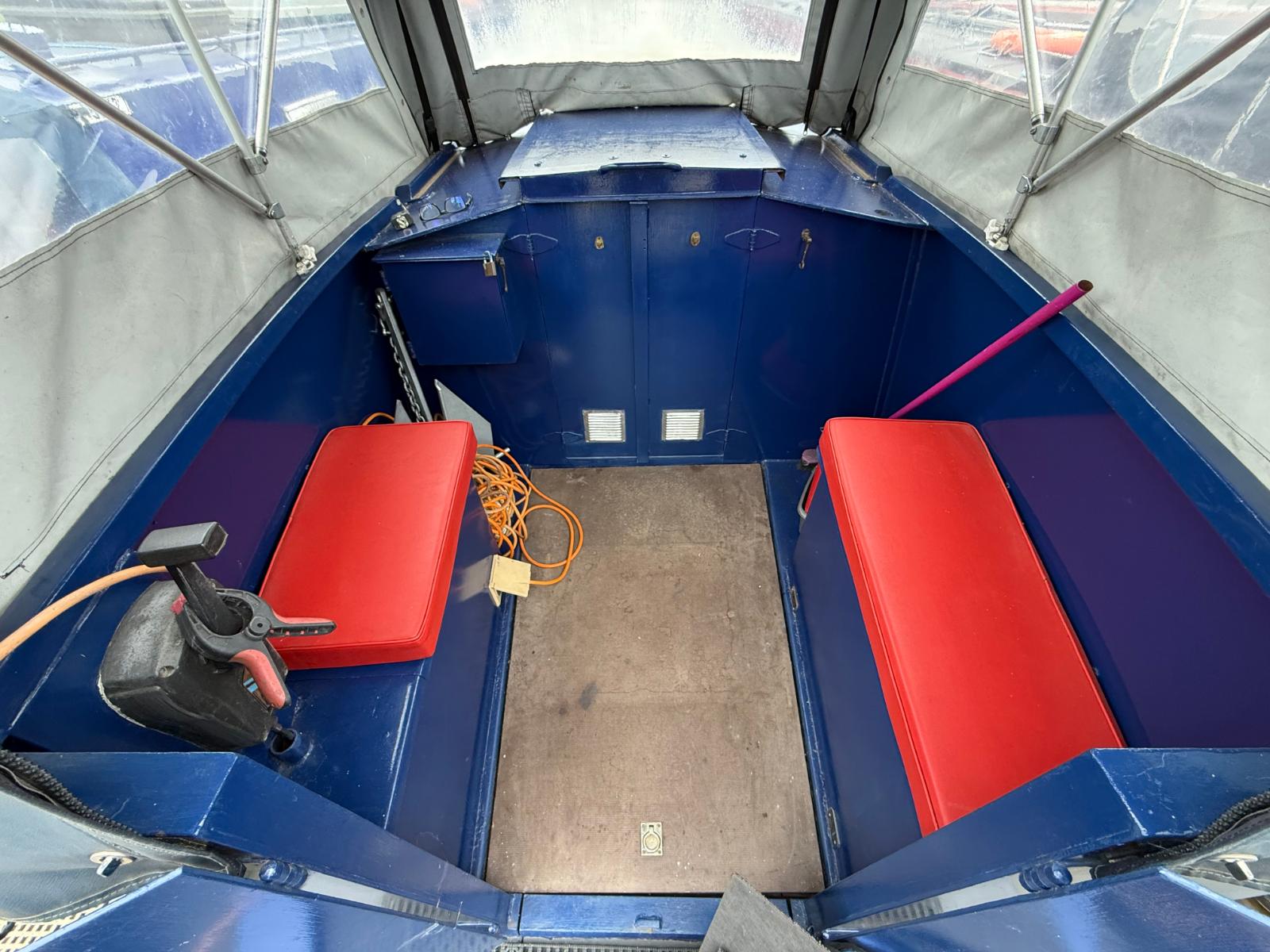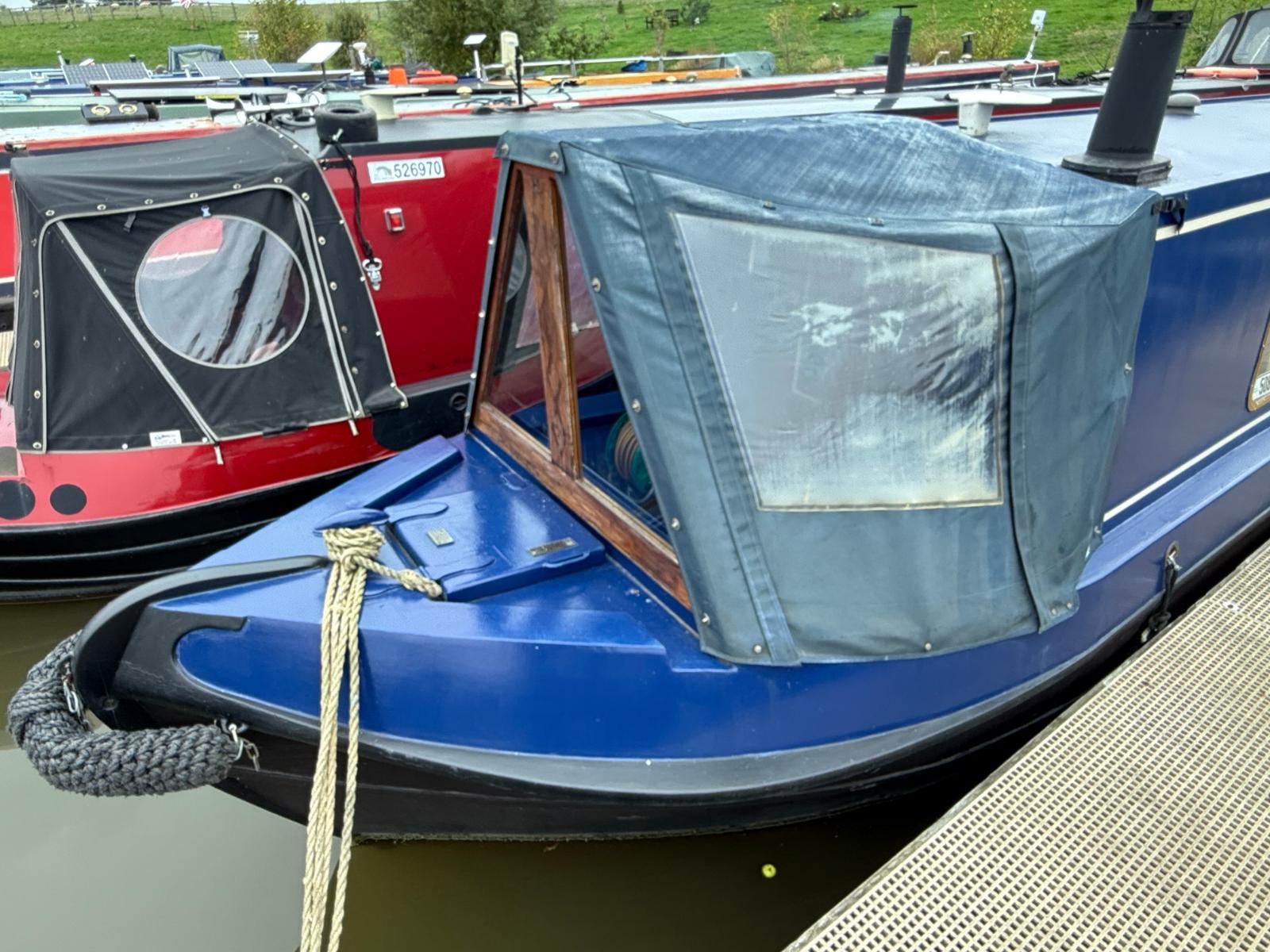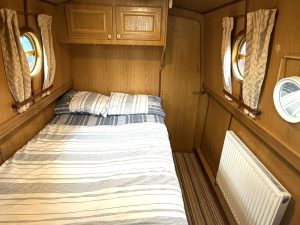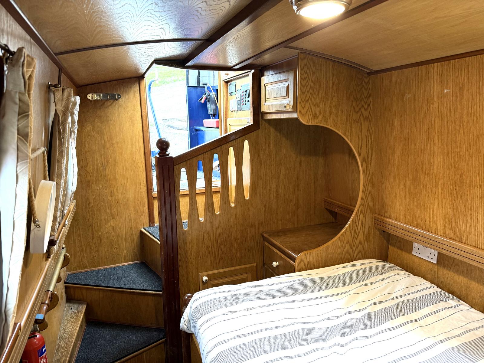 Step aboard under the pram-covered stern into a traditional layout with an aft bedroom featuring a 4ft fixed double bed, overhead cupboards, and under-bed drawers.