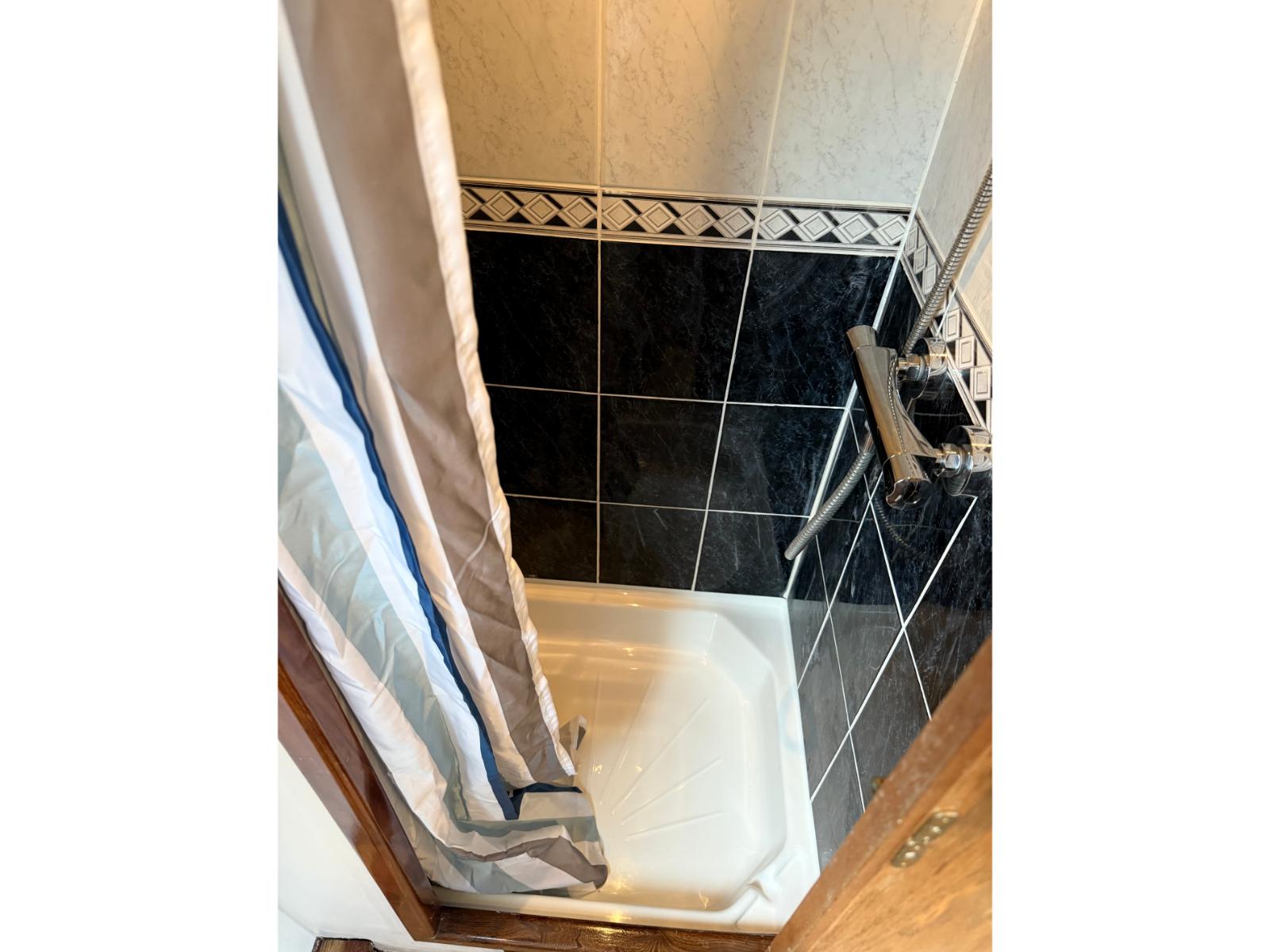 A light and modern bathroom offers a tabletop washbasin on top a cupboard hiding a washing achine, good shower and pump-out toilet.