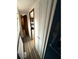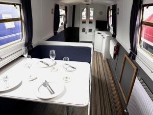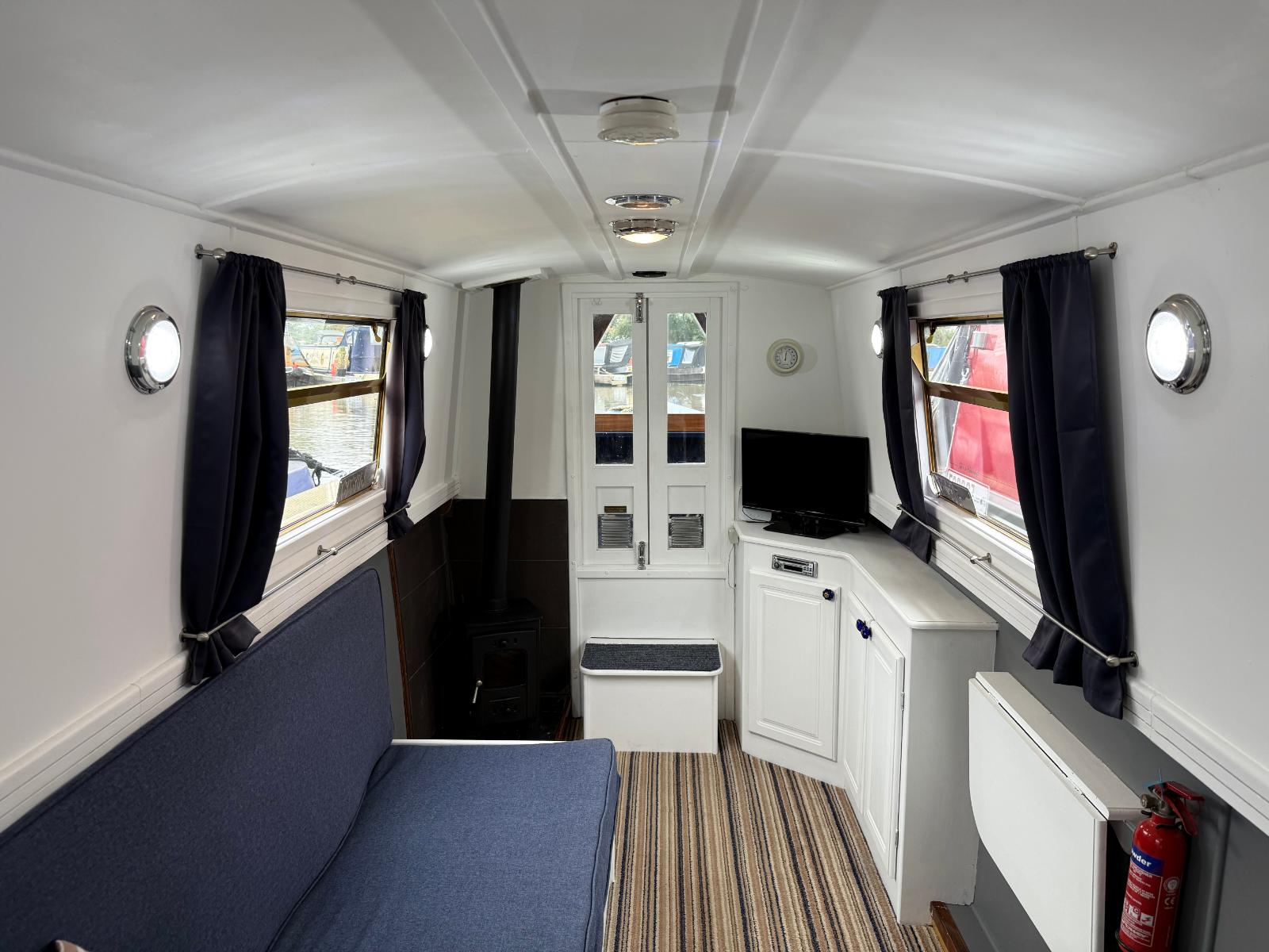 The saloon incorporates a pullman dinette providing additional guest berths before leading into the comfortable fixed seating, a solid fuel stove, and TV — perfect for relaxing afloat.