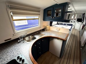 A U-shaped galley follows, with excellent storage, a 3-burner hob, oven/grill, and undercounter fridge.