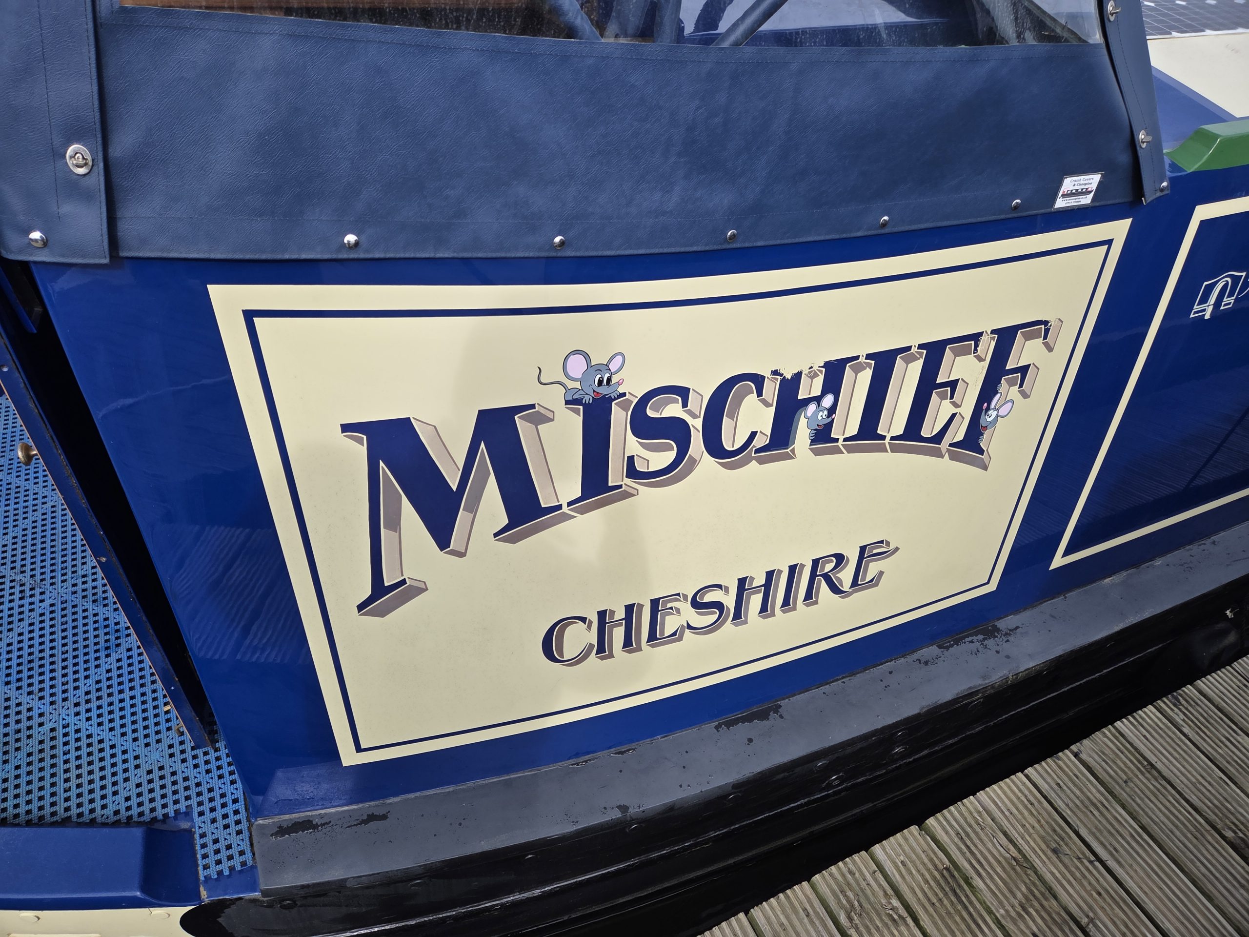 Mischief is a 50ft traditional stern narrowboat built in 2004 by Maesbury Marine Services Ltd. She features an attractive ‘Josher’ style bow, complete with decorative false rivets along the hull, giving her a distinctive and characterful appearance.