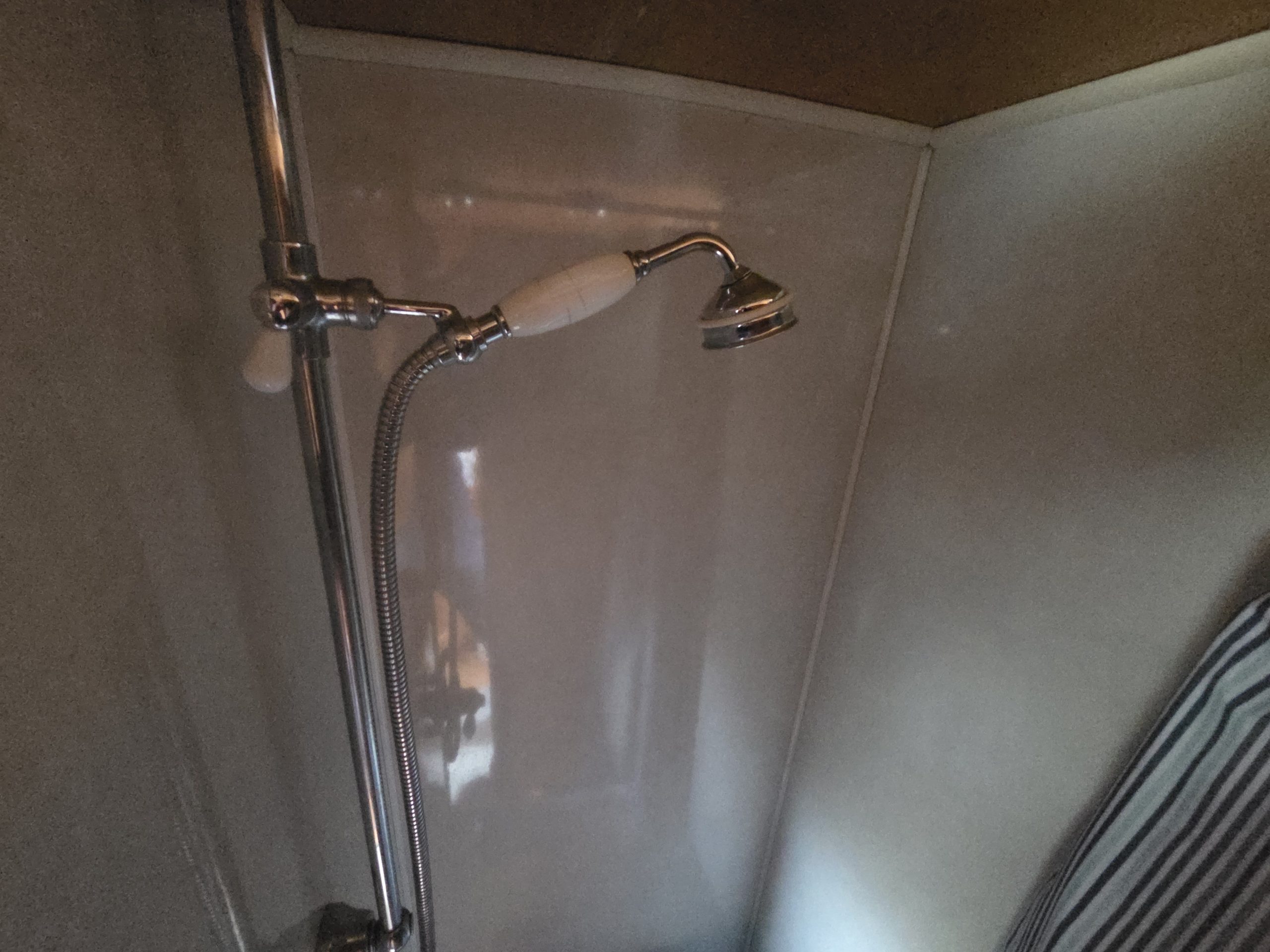 Bathroom: Thetford Pump Out toilet, corner cupboard, sink, heated towel rail, enclosed shower, unused Porta Potti.