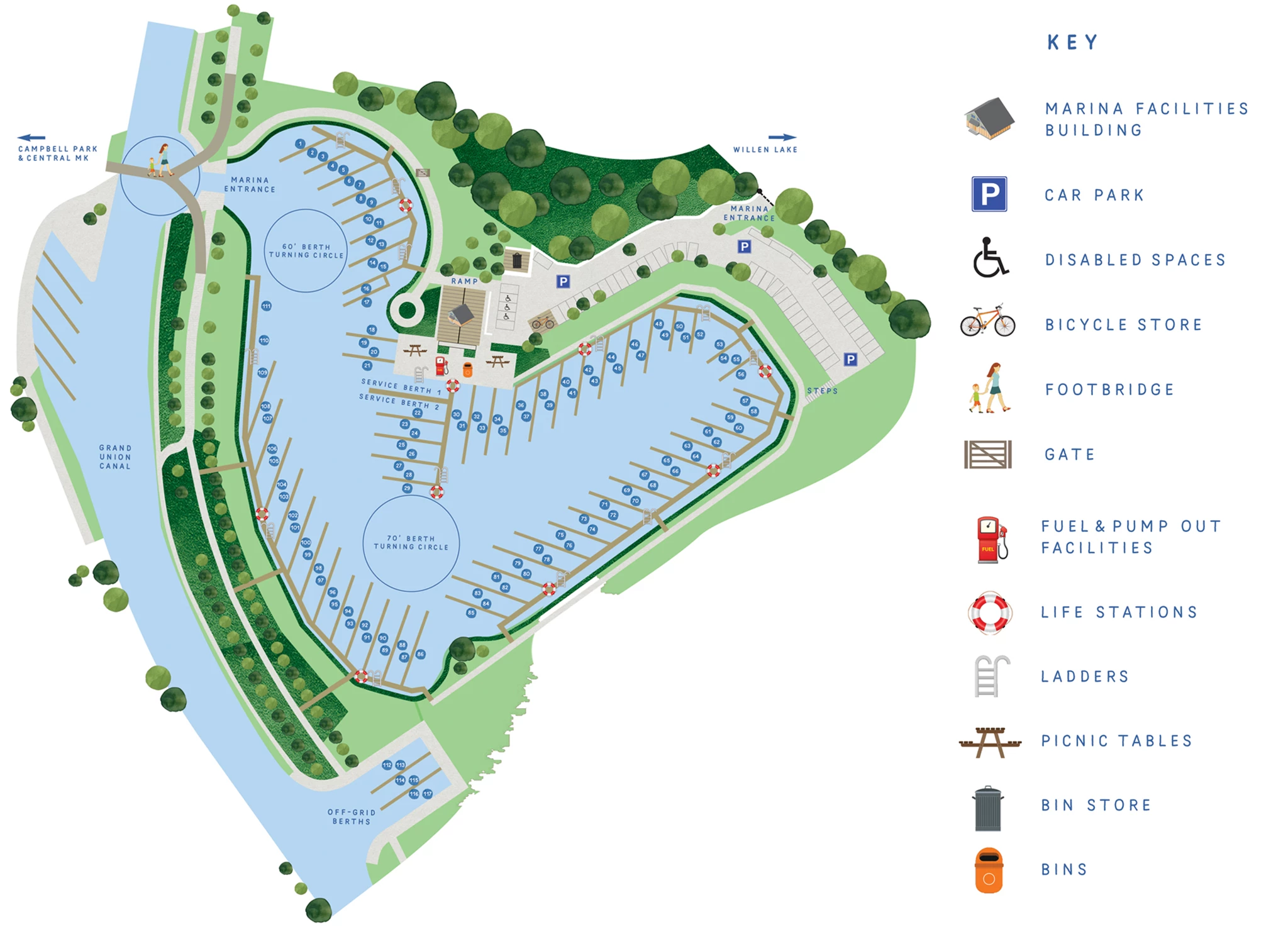 Campbell Wharf Marina opened in May 2019. Since then, it has proved popular due to its enviable location on the Grand Union Canal in Campbell Park, just a short walk from central Milton Keynes and a 35-minute train ride from London Euston. Recently recognised as the 'Inland Marina of the Year' by the Yacht Harbour Association, it's the ideal destination for those who enjoy both the city and countryside.
